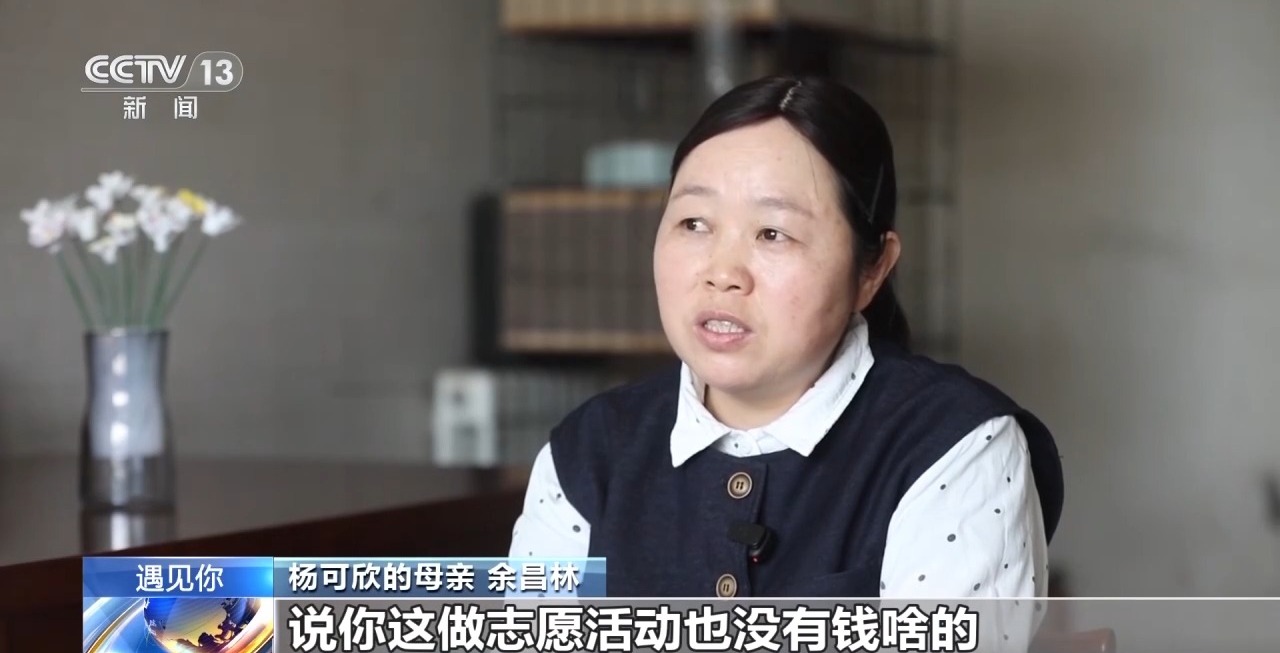 杨可欣的母亲 余昌林:有好多人觉得不理解,做志愿活动也没有钱,刚开始时杨振亚做,我也觉得理解不了,时间久了,感觉做志愿活动也有“瘾”一样,能帮助到别人很开心。