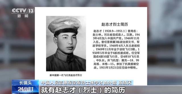 中国人民志愿军空军烈士朱学才的外甥 陈绕天:我没放弃。在我姨妈给我的我舅舅简历上面就有赵志才的简历。赵志才烈士标注曾用名赵士林,我马上又打电话过去了,我说有没有赵士林烈士,他说赵士林有,他是飞行员烈士。