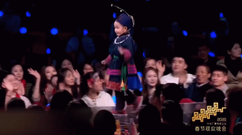 2026年中央广播电视总台春节联欢晚会上,来自贵州麻江深山的6岁瑶族女孩杨佳羽大方展示民族服饰。