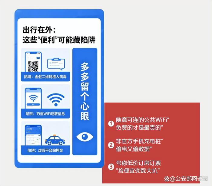 高铁站、商场、咖啡店中随意可连的免费公共WiFi,看似能省流量,实则可能是黑客搭建的“钓鱼WiFi”。一旦连接,你的手机银行密码、支付信息、聊天记录都可能被实时监控窃取,甚至被植入木马程序,导致账号被盗、财产受损。