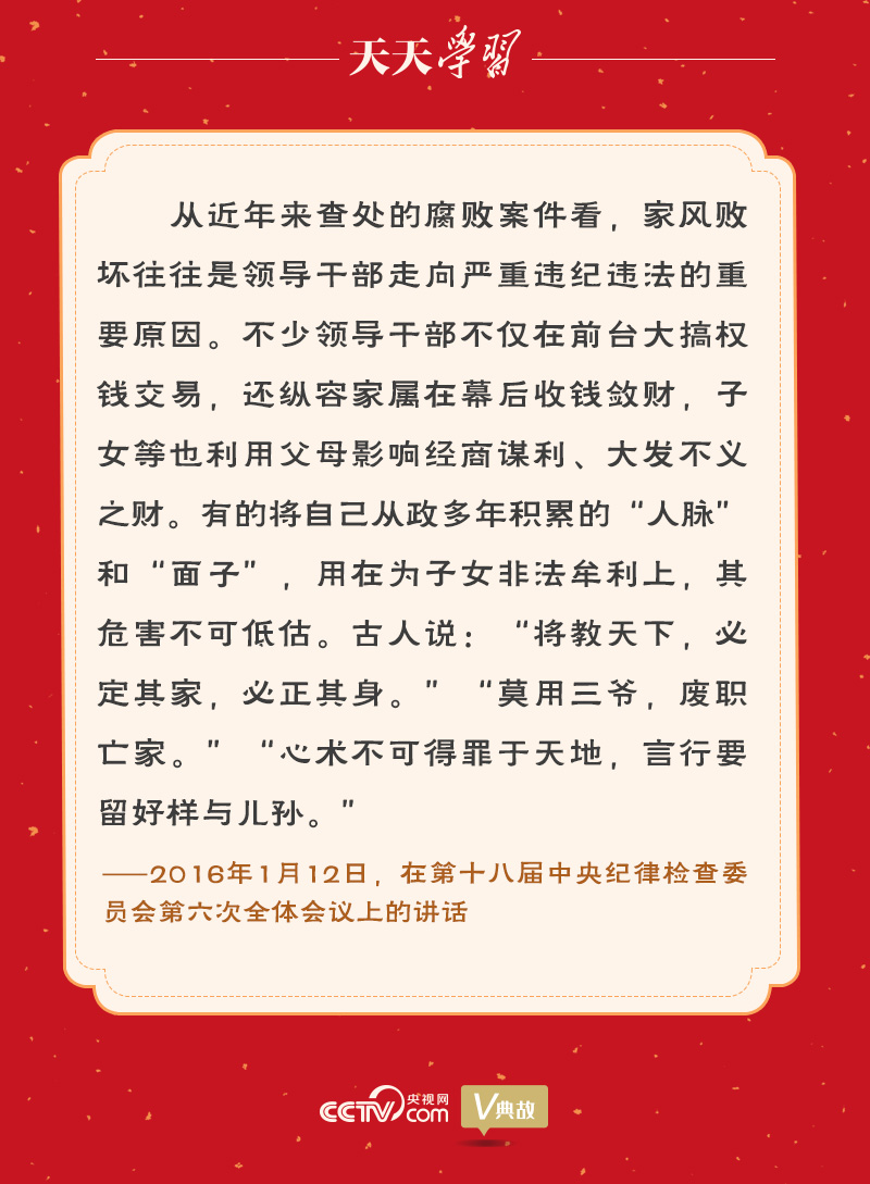 习近平总书记多次引经据典,要求各级领导干部带头抓好家风、广大家庭弘扬优良家风,《天天学习》特撷取其中经典语句,与您一起学习领悟。