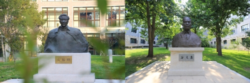 拼版照片:左图为中央党校(国家行政学院)校园内的焦裕禄雕塑;右图为中央党校(国家行政学院)校园内的谷文昌雕塑。