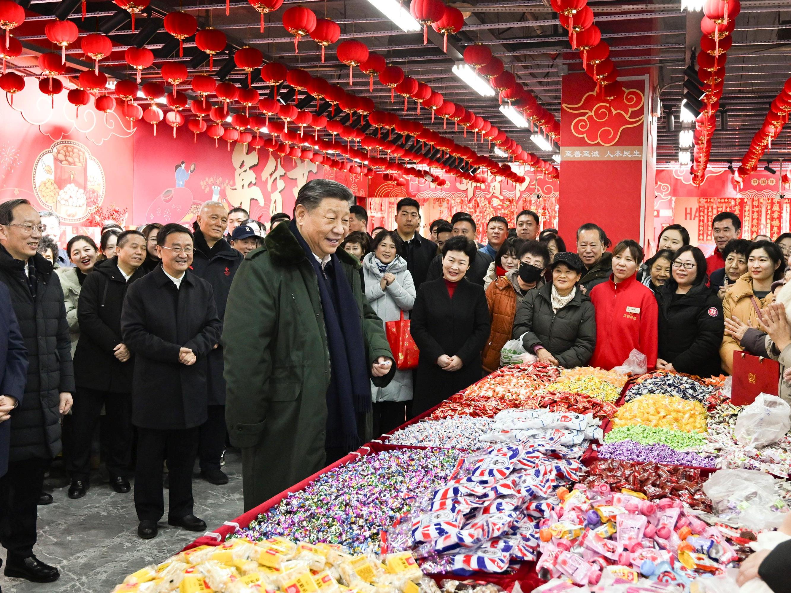 △2025年1月23日,习近平总书记在辽宁沈阳大东副食品商场考察时,同店主和顾客亲切交流,向大家致以新春祝福。