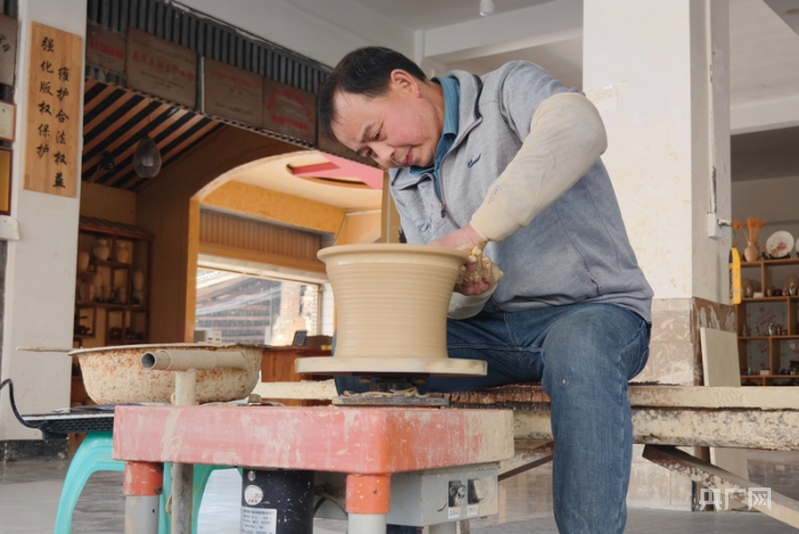 母先才在自己的陶艺馆内制作盬子(央广网记者 栾小琳 摄)