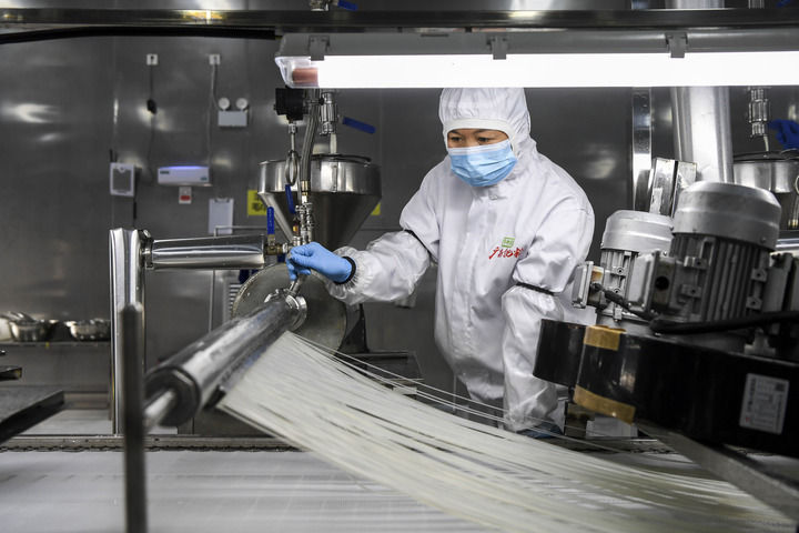 在广西柳州市一家螺蛳粉生产企业,工作人员在查看米粉的生产情况(2024年12月13日摄)。新华社记者 曹祎铭 摄