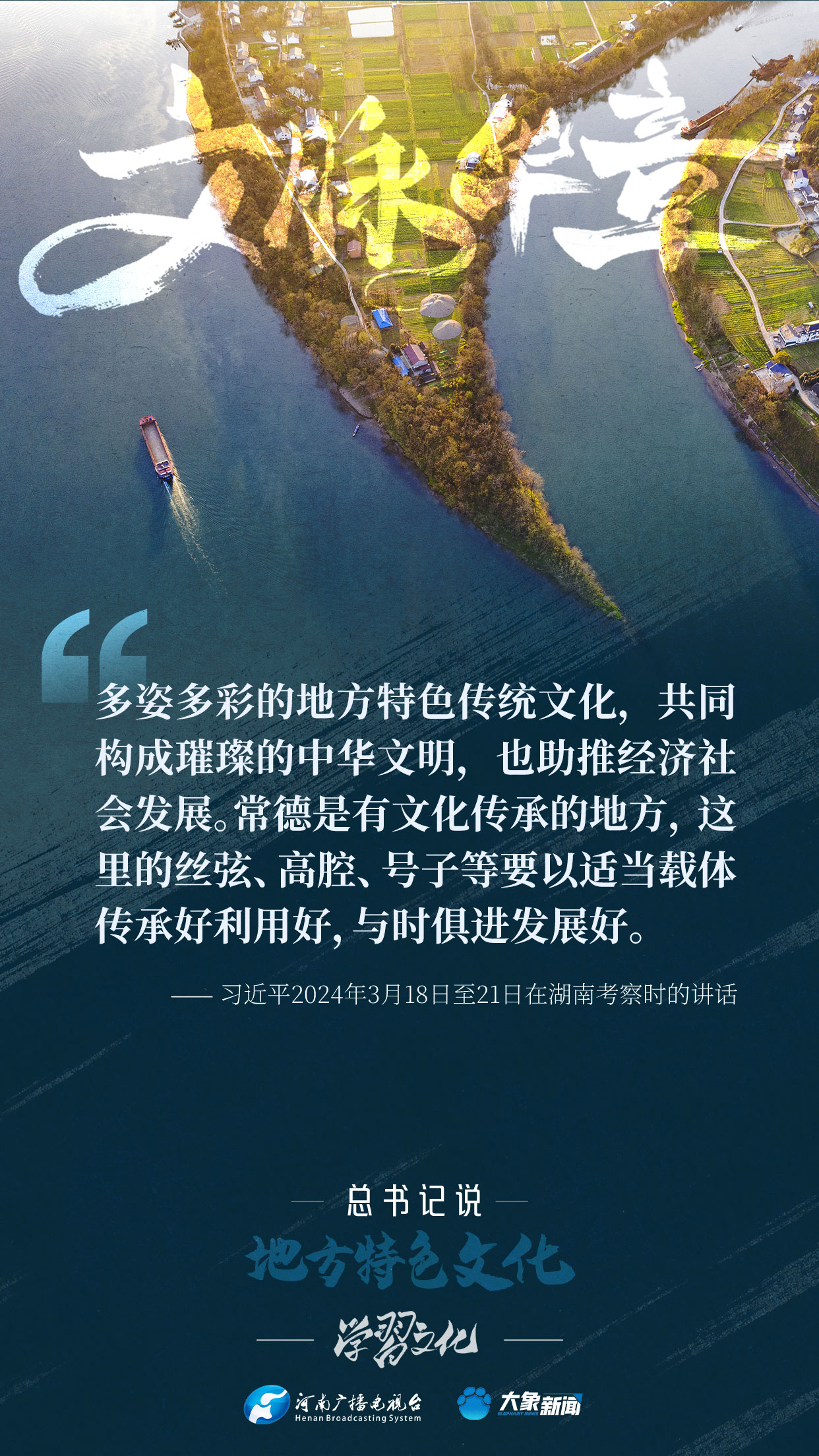 习近平总书记2024年3月18日至21日在湖南考察时指出:多姿多彩的地方特色传统文化,共同构成璀璨的中华文明,也助推经济社会发展。