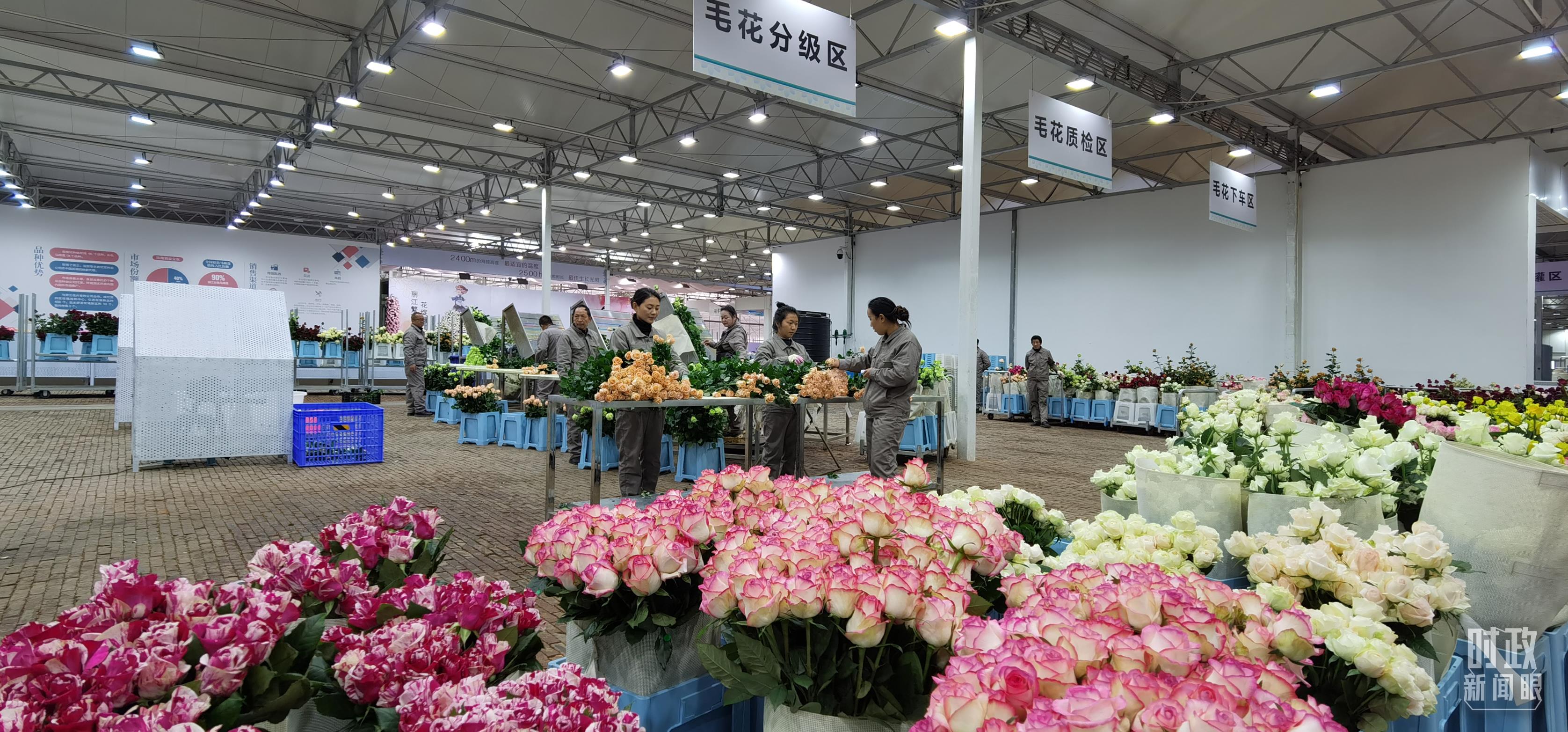 △丽江现代花卉产业园内,工人正在分类整理鲜花。(总台央视记者郭鸿拍摄)