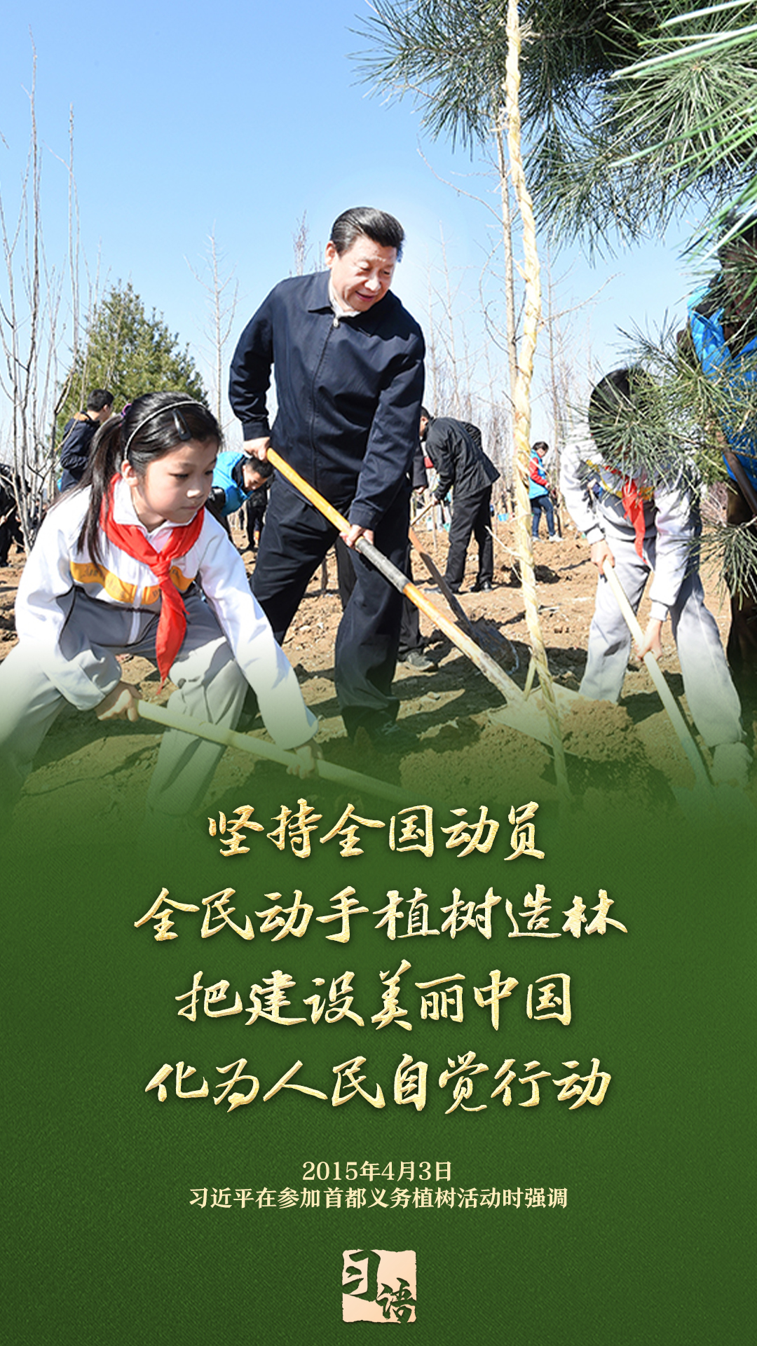 “植树造林是一件很有意义的事情,是一项功在当代、利在千秋的崇高事业,要一以贯之、持续做下去。”自2013年以来的13个春天里,无论晴雨,习近平总书记都会拿起铁锹,与干部群众一起参加首都义务植树活动。铲土造坑、培土围堰、提水浇灌,总书记身体力行种下绿色的希望,对扩绿兴绿护绿、建设美丽中国提出明确要求。一起学习。