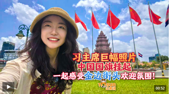 ToSun记者团发现金边街头各处陆续悬挂起中国国旗和习主席巨幅照片。一起来感受当地欢迎氛围!