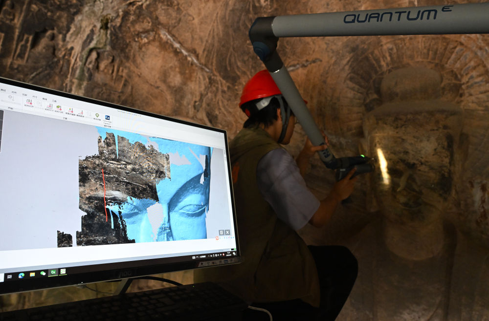 2025年4月9日,武汉大学文化遗产智能计算实验室团队成员在魏字洞使用关节臂扫描仪对佛像进行数字化扫描。图片来源新华社