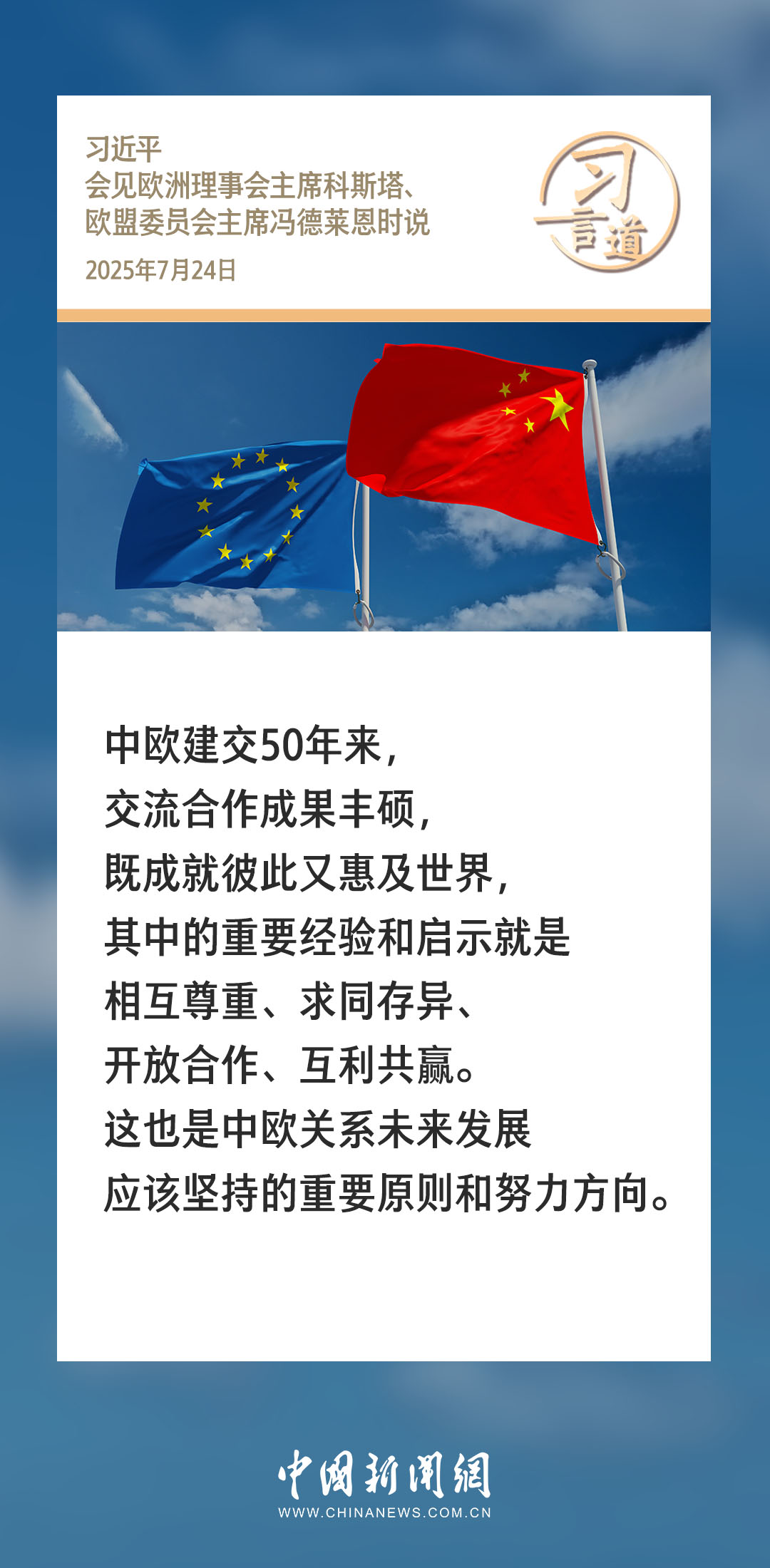 中国新闻网讯 7月24日,国家主席习近平在北京人民大会堂会见来华举行第二十五次中国-欧盟领导人会晤的欧洲理事会主席科斯塔和欧盟委员会主席冯德莱恩。习近平指出——