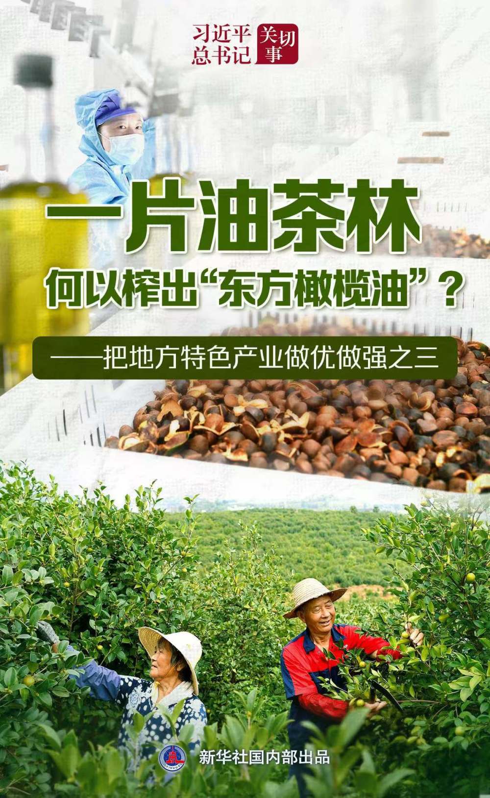 习近平总书记一直关心油茶产业发展。2015年全国两会期间,习近平总书记在参加江西代表团审议时,拿出百岁老红军王承登写的一封希望国家加大对赣南茶油等扶贫产业支持的信,对在场的部委负责同志说,这个可以去做些调研。