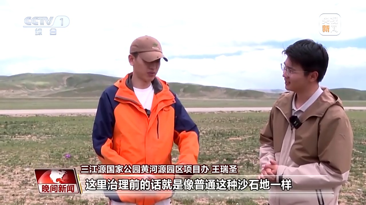 三江源国家公园黄河源园区项目干事 王瑞圣:这里治理前就像普通沙石地一样,治理完的成效就是这样子的,我们的草籽就在当时切割的凹槽里面生长,这些草籽好多根部已经进行分裂了,所以会显得非常茂密。