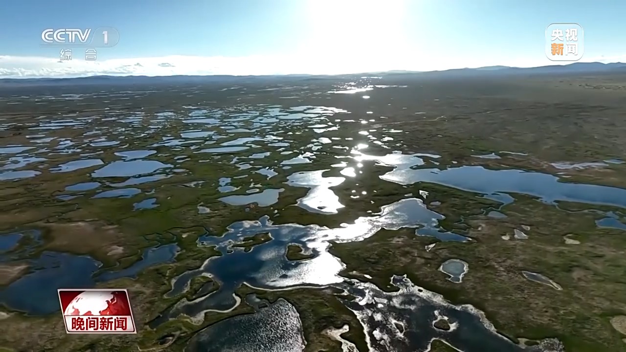 从高空俯瞰,无数湖泊沼泽,在阳光的照耀下,星星点点、光彩夺目,如同绽放的花朵,点缀在高原之上。