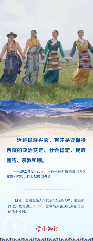 2025年8月20日,习近平总书记率中央代表团乘专机抵达拉萨,出席西藏自治区成立60周年庆祝活动。在听取西藏自治区党委和政府工作汇报时,习近平总书记强调,“持续深入抓好稳定、发展、生态、强边四件大事,努力建设团结富裕文明和谐美丽的社会主义现代化新西藏”。