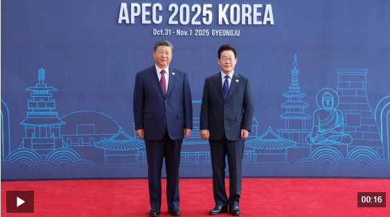 习近平主席抵达时,韩国总统李在明热情迎接。两国元首握手、合影,留下珍贵的“APEC瞬间”。随后,两位领导人微笑交谈,共同步入会场。