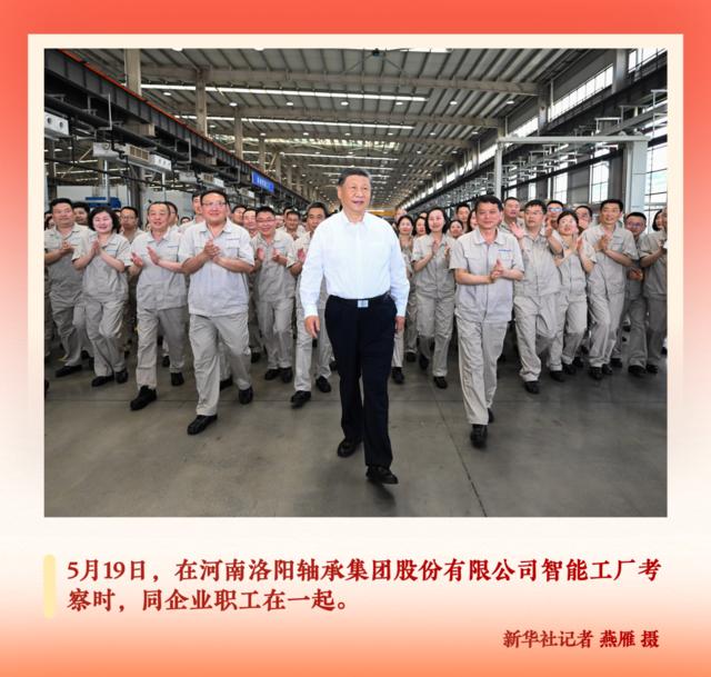“到厂里多久了?”“什么学历?”“上岗培训是怎么做的?”“收入怎么样?”初夏时节考察河南,习近平总书记同洛阳轴承集团股份有限公司的职工们亲切交流,勉励他们“发扬主人翁精神”。大家簇拥在总书记身边,意气风发,大步向前。
