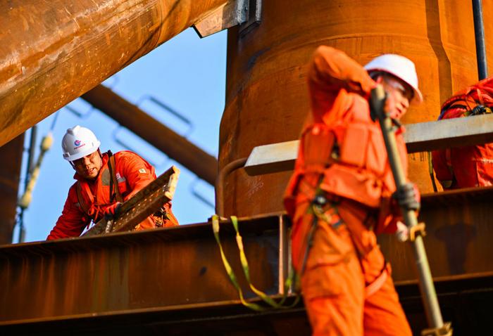 2026年2月13日,工人在位于渤海中部海域的渤中26-6油田开发项目(二期)作业现场施工。新华社记者 赵子硕 摄