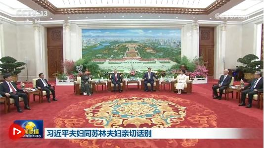 央视网讯 4月15日下午,中共中央总书记、国家主席习近平和夫人彭丽媛同来华进行国事访问的越共中央总书记、国家主席苏林和夫人吴芳璃亲切话别。