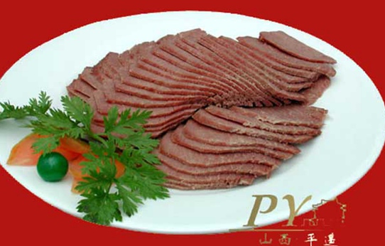 平遥牛肉是山西晋中地区平遥县的汉族传统名菜。传统制作工艺独特,从生牛屠宰,生肉切割、腌渍、锅煮等操作程序和操作方法,到用盐、用水以至加工的节气时令等,都十分讲究。所产牛肉,色泽红润,肉质鲜嫩,肥而不腻,瘦而不柴,醇香可口,营养丰富,具有扶胃健脾之功效。
