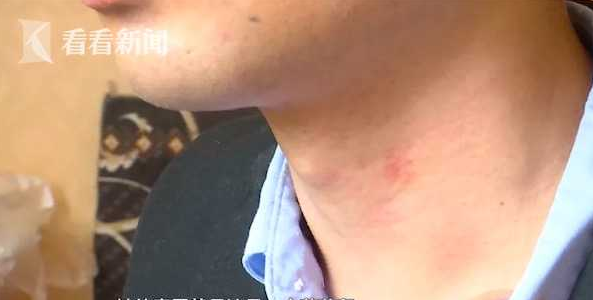 记者看到,在王先生的喉结左侧,确实有一个红色的印痕。