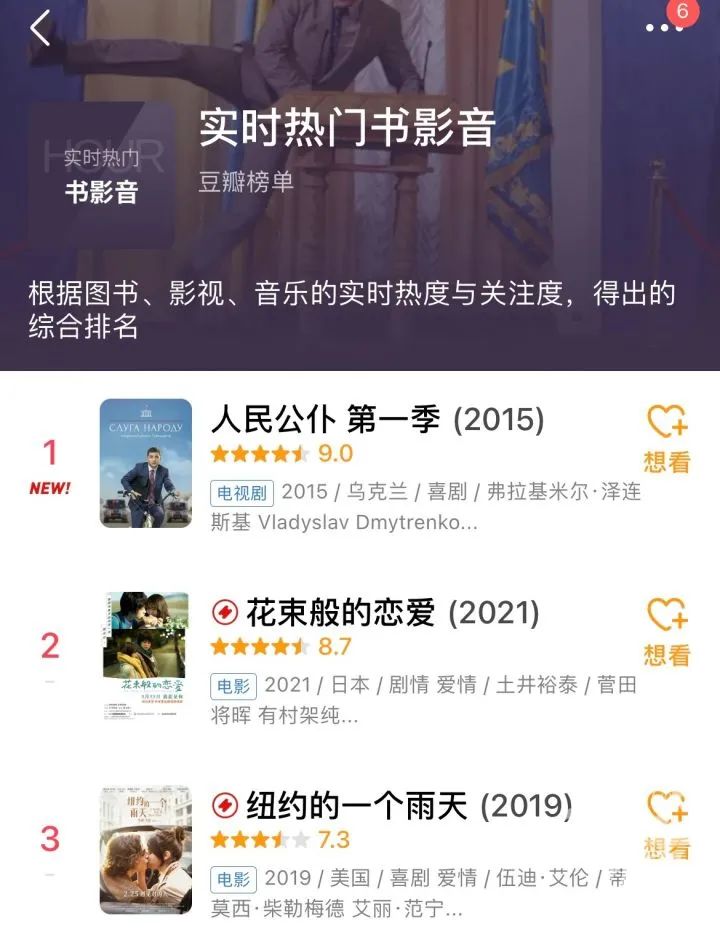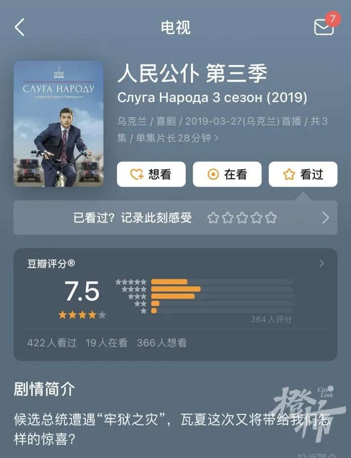 一部乌克兰的喜剧《人民公仆》(第一季)今天也冲上了豆瓣实时热门书影音第一名。而这部剧的主演,正是目前乌克兰的总统弗拉基米尔·泽连斯基。