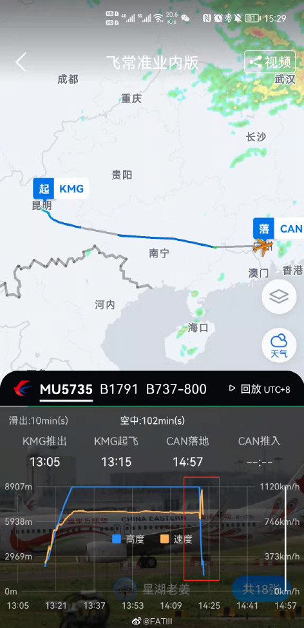 东方航空MU5735,由昆明飞往广州,目前根据Flightradar24显示,速度和高度在梧州附近出现骤降。