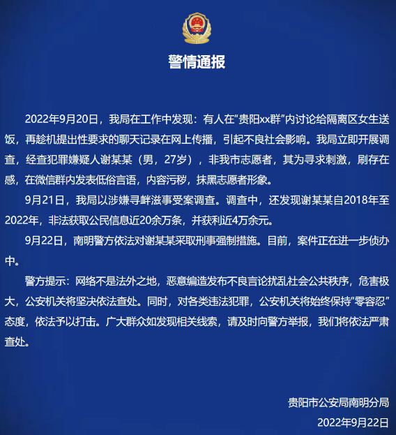 9月22日,贵州省贵阳市公安局南明分局发布通报,9月20日,该局在工作中发现:有人在“贵阳xx群”内讨论给隔离区女生送饭,再趁机提出性要求的聊天记录在网上传播,引起不良社会影响。