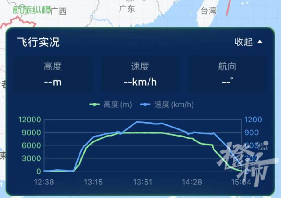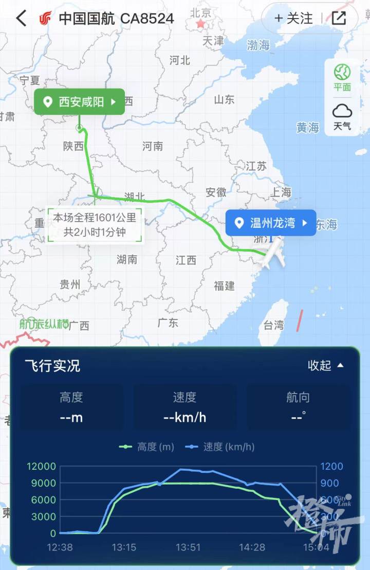 据了解,CA8524航班由西安咸阳国际机场飞往温州龙湾国际机场,计划12点45分起飞,15点20分到达,全程1601公里。