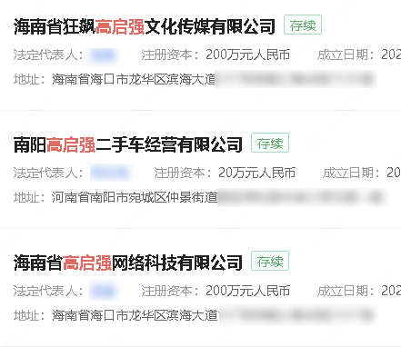 南阳高启强二手车经营有限公司成立于2023-02-16,法定代表人名字,和剧中高启强仅仅一字之差。