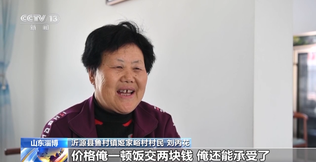 山东省淄博市沂源县鲁村镇姬家峪村村民 刘丙花:价格俺一顿饭交两块钱,俺还能承受了,再多交个一块两块钱也还能行。