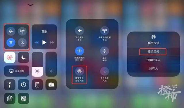 从控制中心关闭AirDrop:长按左图的方框区域→选择“隔空投送”→接收关闭
