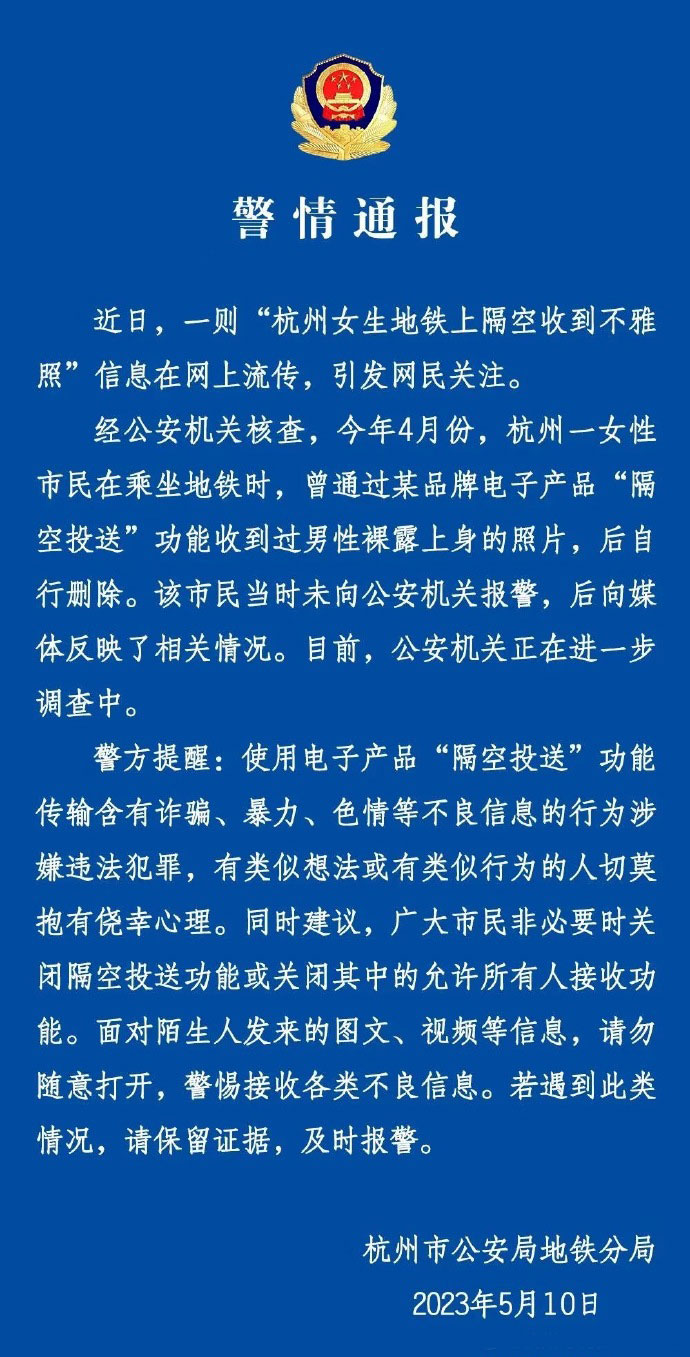 通报里,提到了“杭州女生地铁上隔空收到不雅照”一事。