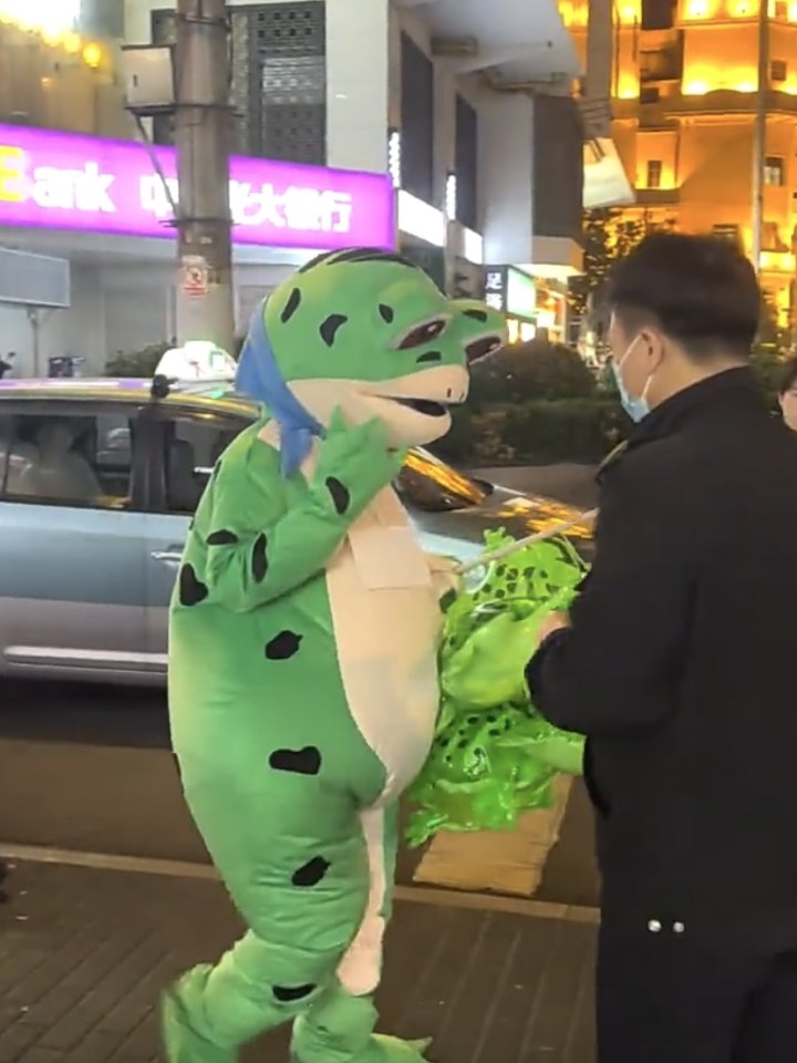 青蛙人偶走在路上卖玩具被制止。 视频 金洁洁