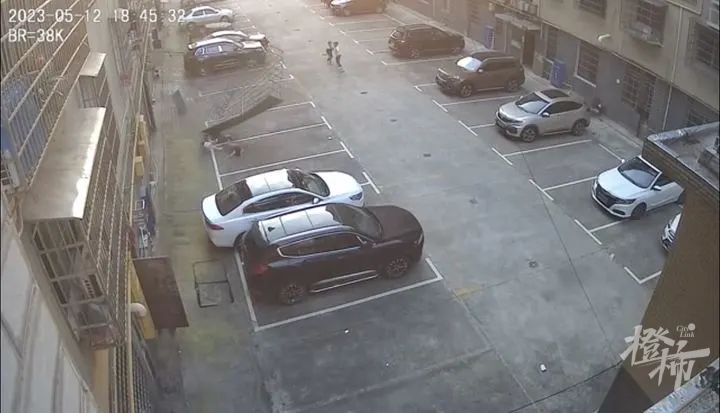 网上流传的监控视频,时间显示为5月12日下午6点45分左右,一防盗窗从天而降砸在地面。不幸的是,与防盗窗一同落下的,还有两名儿童。