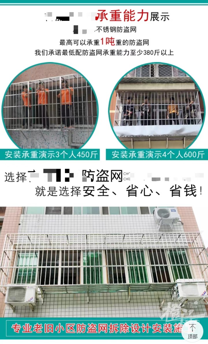 而在杭州做防盗门窗的另一位师傅也认同了洪师傅的说法。他表示,自家做的产品承重也都基本在100斤左右,如果加装支撑架,可以达到200斤的承载。