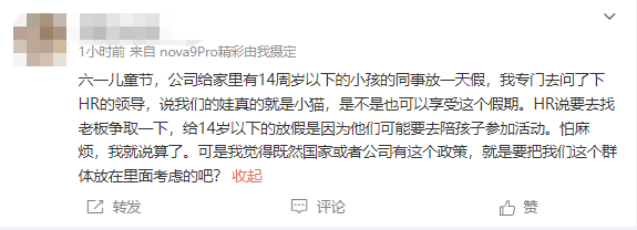 有位网友在社交平台上提问,自己所在公司六一儿童节放假,公司给家里有14周岁以下的小孩的同事放一天假,自己的娃就是小猫,能不能也享受假期?
