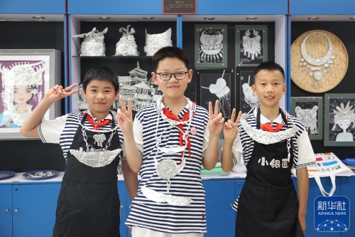 ↑6月9日,湖南省长沙市朝阳小学学生们在特色美育课上展示有苗族银饰特色的手工作品。