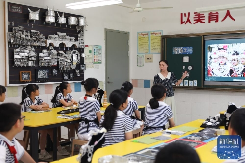 苗族银饰锻制技艺是苗族喜爱的民间传统工艺,主要用于制作头饰、面饰、颈饰、手饰等苗族饰品。近年来,在湖南省文化馆(湖南省非物质文化遗产保护中心)的支持下,长沙市朝阳小学开设“无银无花不成美”特色美育课程,教授苗族银饰的历史渊源、造型特点、主要分类、工艺流程、服饰搭配技巧等,学生们在课堂上可以利用锡箔纸、易拉罐、零食包装袋等生活中便于获取的材料制作有苗族银饰特色的手工作品,让学生们在对苗族银饰的欣赏与制作中,感受非遗之美,传承优秀的传统文化。