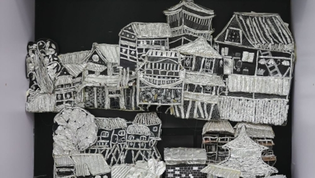 ↑这是6月9日在湖南省长沙市朝阳小学拍摄的有苗族银饰特色的学生手工作品。