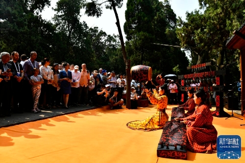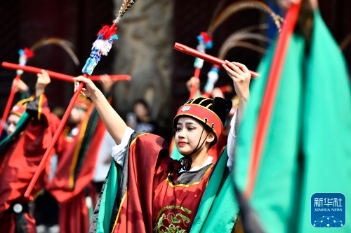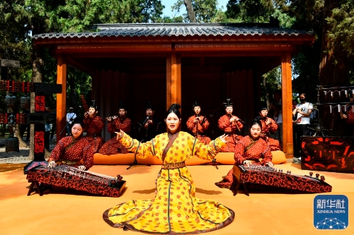 ↑6月27日,在曲阜孔庙,工作人员进行以《诗经》为主题的雅乐表演。
