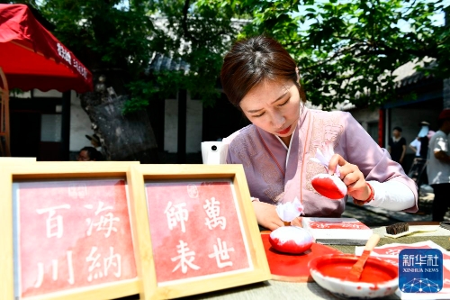 ↑6月27日,在曲阜孔庙,工作人员在展示拓片制作。
