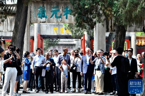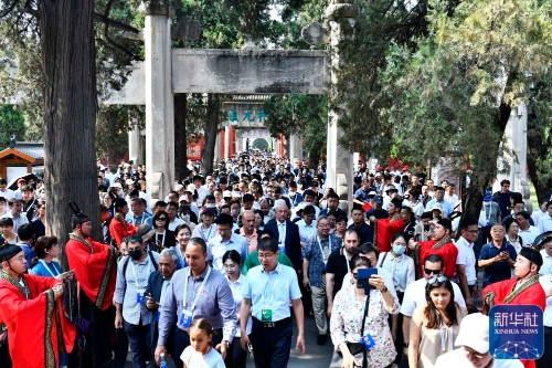 ↑6月27日,参加世界互联网大会数字文明尼山对话的中外与会嘉宾和游客在曲阜孔庙参观。
