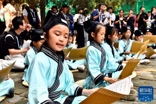 ↑6月27日,在曲阜孔庙,嘉宾和游客在聆听孩子们诵读《论语》。