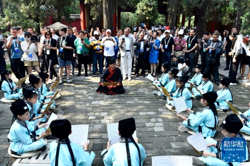 ↑6月27日,在曲阜孔庙,嘉宾和游客在观看以《诗经》为主题的雅乐表演。