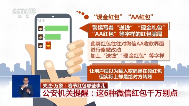 警惕写着“送钱”“现金礼包”“AA红包”等字样的红包骗局。此类红包往往对微信AA收款界面进行略微改动,加上“送钱”“现金红包”等字样,让用户误以为输入密码是在领红包,但实际上却是给对方转账。正规的微信红包界面是橙红色。领取红包并不会进入AA收款界面。