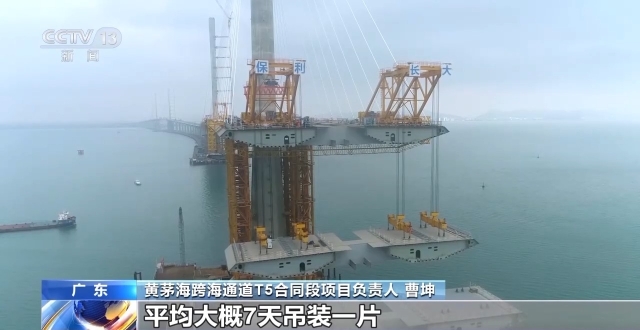 黄茅海跨海通道T5合同段项目负责人 曹坤:目前进行的主要工作是钢箱梁的吊装,平均大概7天吊装一片,预计2024年7月初完成全部钢箱梁吊装,全桥合龙。