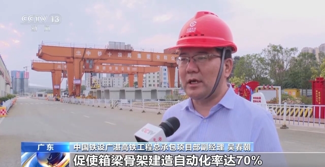 中国铁设广湛高铁工程总承包项目部副经理 吴春朝:生产线的投产促使箱梁骨架建造自动化率达70%,劳动强度降低80%,工人减少30%以上,成本相对减少,质量显著提高。