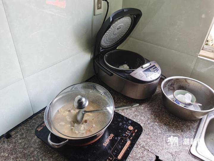 厨房台面上还有早上来不及清洗的碗筷。锅里煮了一些豆腐、叶菜,还剩一点米饭。那是一家人的晚饭,“晚上热一热,又可以吃一顿”。