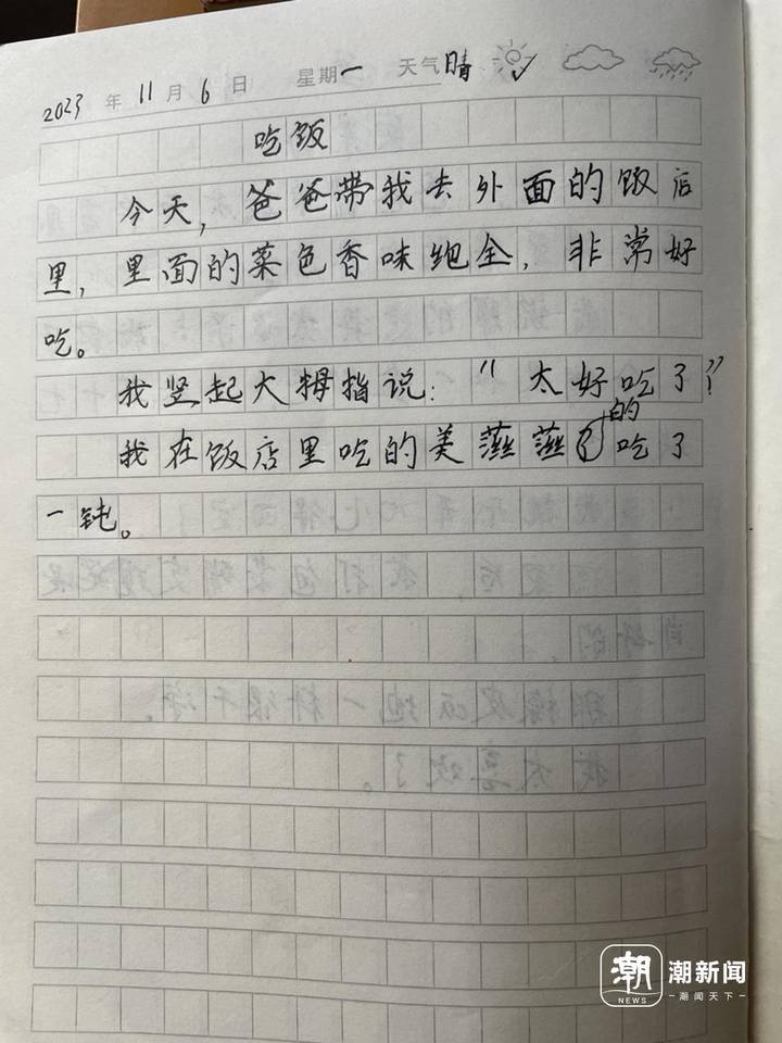 哥哥的日记本里有一篇《吃饭》,字迹很端正,他写道:“今天爸爸带我去外面的饭店,里面的菜色香味俱全,非常好吃,我竖起大拇指说,太好吃了!我在饭店里美滋滋地吃了一顿。”